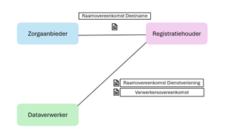 - Raamovereenkomst Dienstverlening (tussen registratiehouder en dataverwerker): hierin zijn de afspraken opgenomen over de uitvoering van de registratie, de technische verwerking en de ondersteuning die de dataverwerker levert aan de registratiehouder.